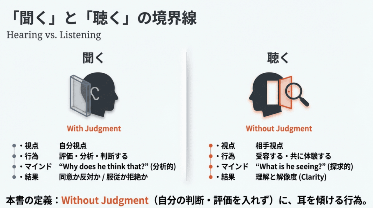 - 「聞く (With Judgment)」: 自分の視点、評価、分析を伴う行為。相手の言葉を自分の既知の知識と照らし合わせ、「正しいか、間違っているか」「自分ならどうするか」を即座に判断する。これは効率的な意思決定には向くが、未知の答えを引き出す力はない。
