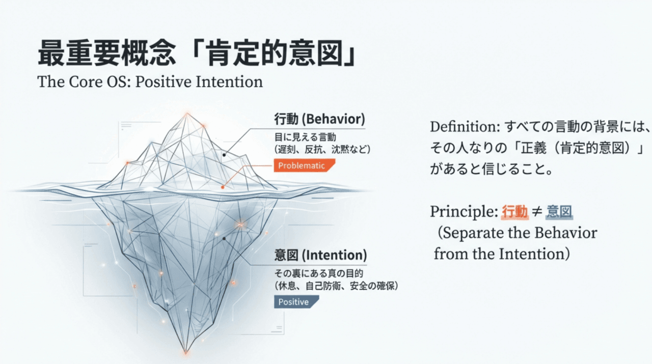 「ちゃんと聴く」を支える真の柱は、やり方(スキル)ではなく、あり方(マインドセット)にある。その核心とは、相手のあらゆる言動の背後には「肯定的な意図」があるという揺るぎない信念だ。