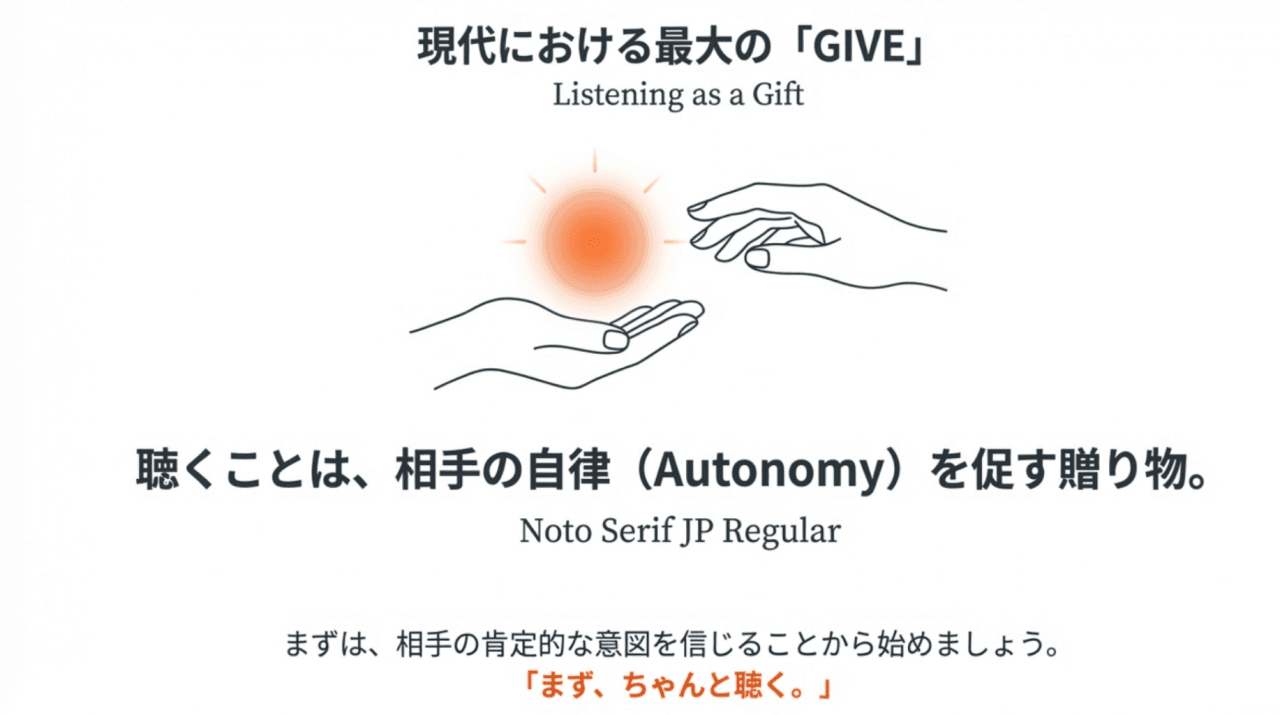 現代において、自分のジャッジメントを脇に置き、相手のために「聴く」時間を割くことは、有限の人生というリソースを捧げる最大級の「Give」に他ならない。聴かれることで人は自己理解を深め、自分の中にある答えに気づく。そして聴く側もまた、自身の観察力の限界を知り、他者の視点を取り入れることで、自己をアップデートし続けることができる。